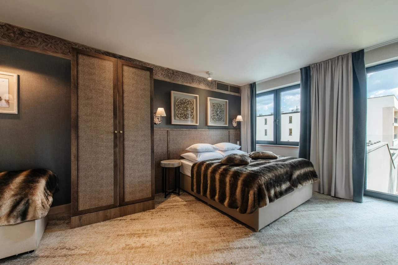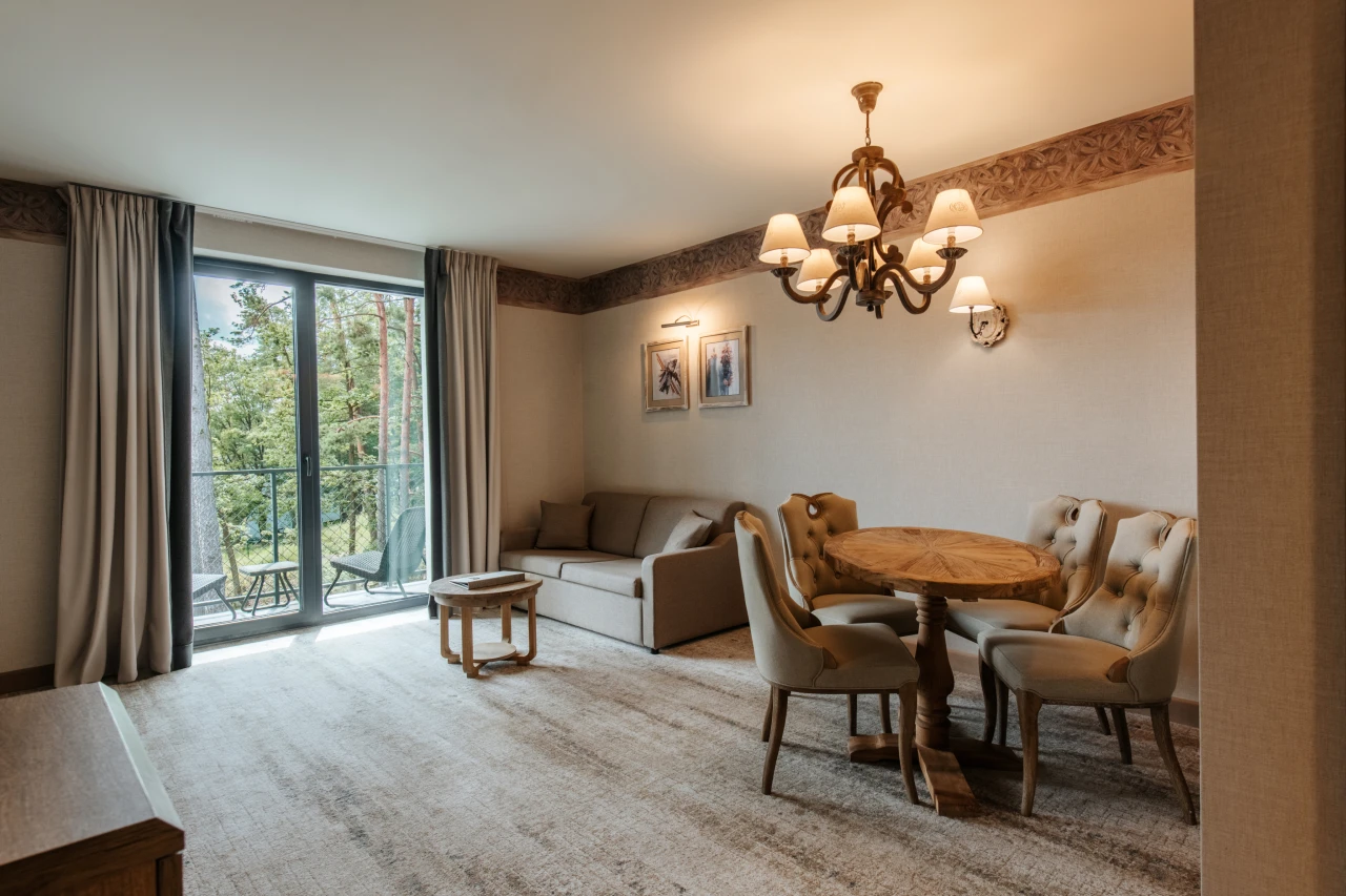 Pokój Lago Triple Suite to luksusowe wnętrze składające się z przestronnej części dziennej w postaci salonu z rozkładaną sofą, wygodnym stołem oraz oddzielnej sypialni dla 3 osób. Panoramiczne okna zapewniają niczym niezakłócone widoki na otaczające hotel lasy. Dopełnieniem oferty 47m2 pokoju jest balkon, na którym można spędzać czas wolny.